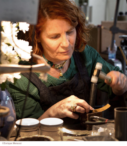 Trabajo en plata y en plata, en bronce y latón chapados en oro de 18 y 24k. Un oro siempre mate y que me recuerda época etrusca. Lo que haces debe tener una profunda relación contigo mismo y todas mis piezas lo tienen.